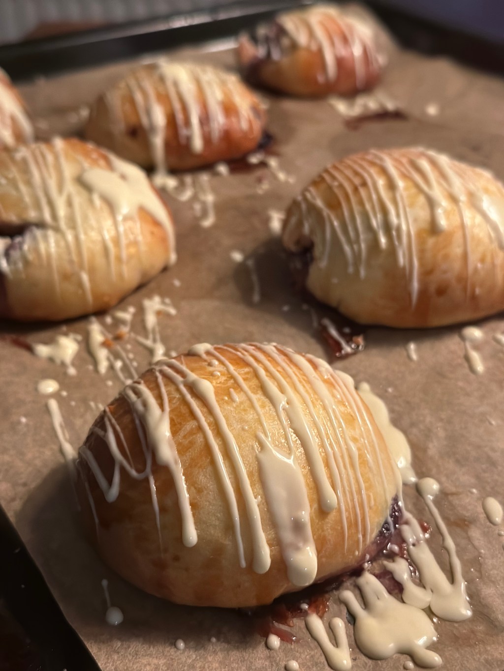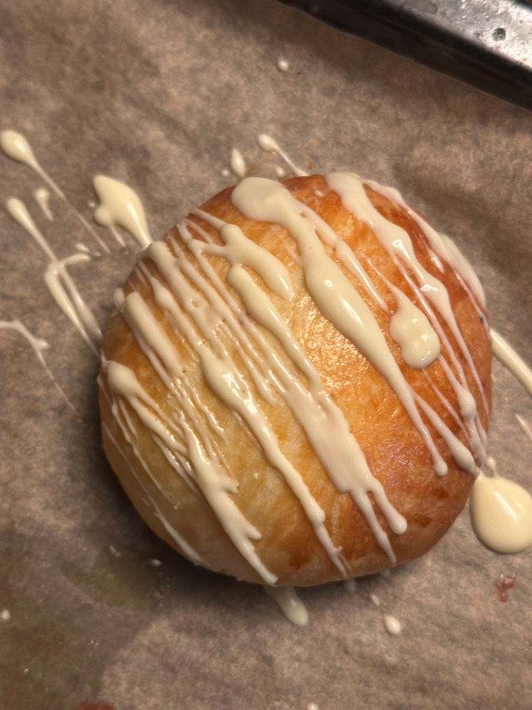 Min yngste søn har bestilt fastelavnsboller med blåbær og hvid chokolade på toppen. Så jeg måtte designe disse på en smørholdig bolledej – og han synes virkelig de var gode, hvilket er den bedste anbefaling jeg kan få.