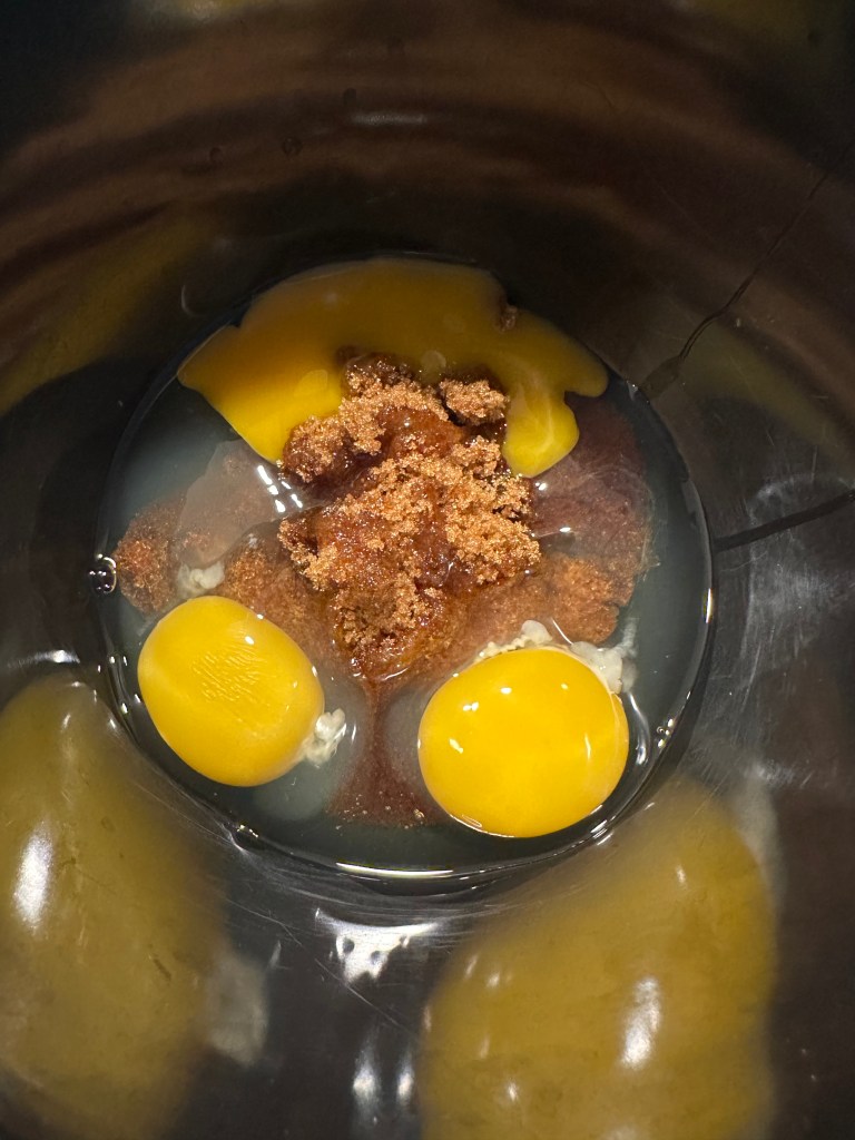 Pisk æg, æggeblommen og brun farin luftig. Tilsæt herefter i dejen, og pisk bed lav hastighed. Dejen er nu færdig.