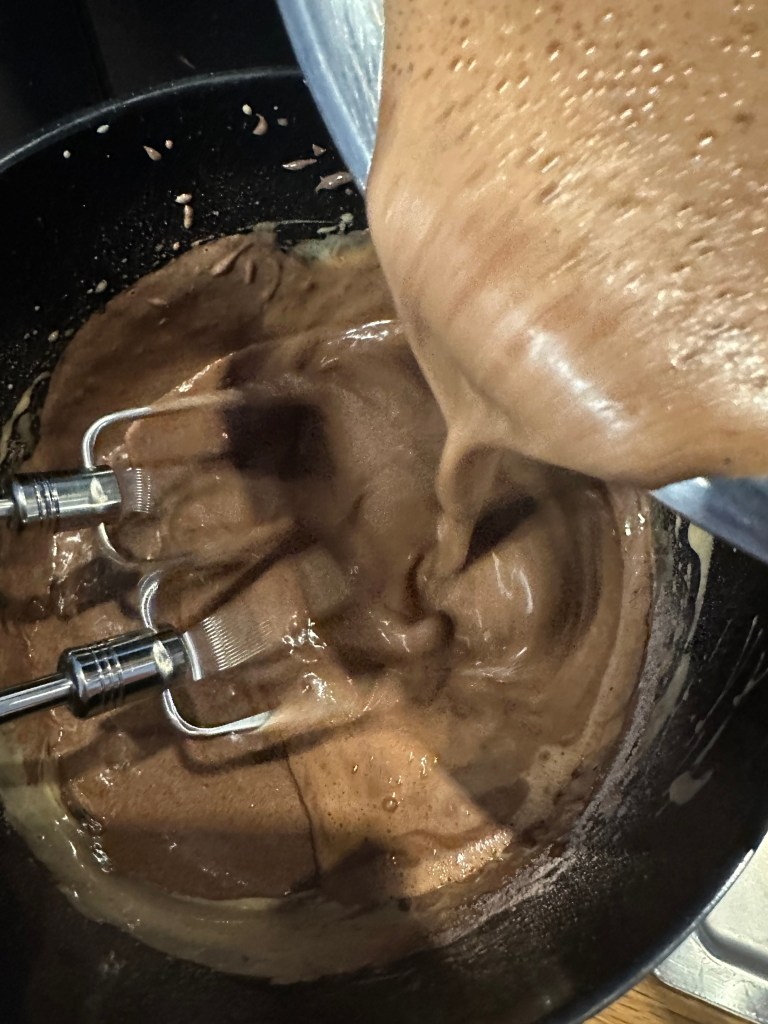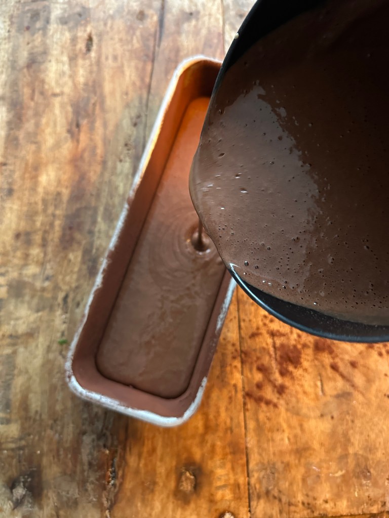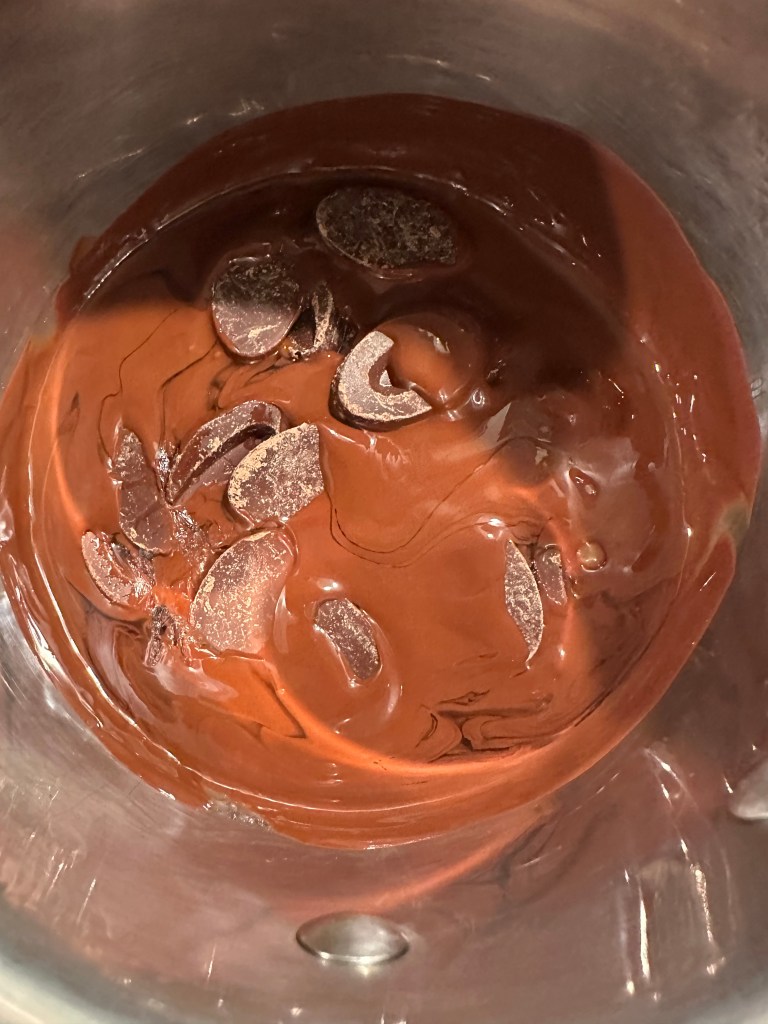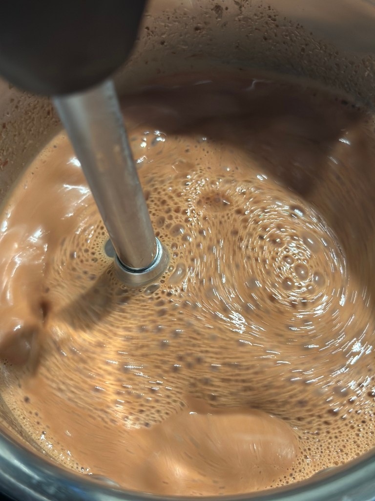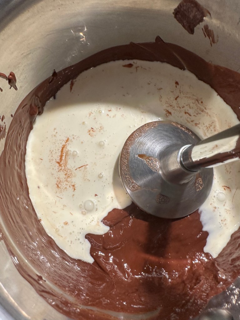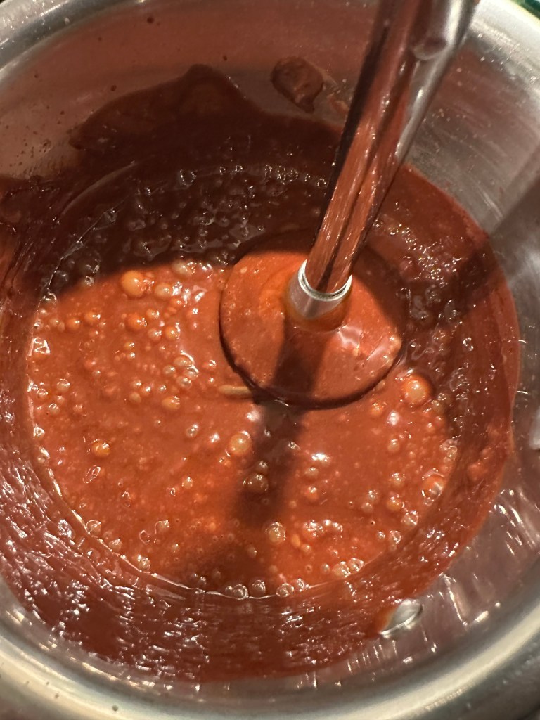 Kom nu smør, chokolade og vand i en lille kasserolle, og lad det smelte sammen ved lav varme. Ikke koge. Brug en stavblender til at få massen homogen.