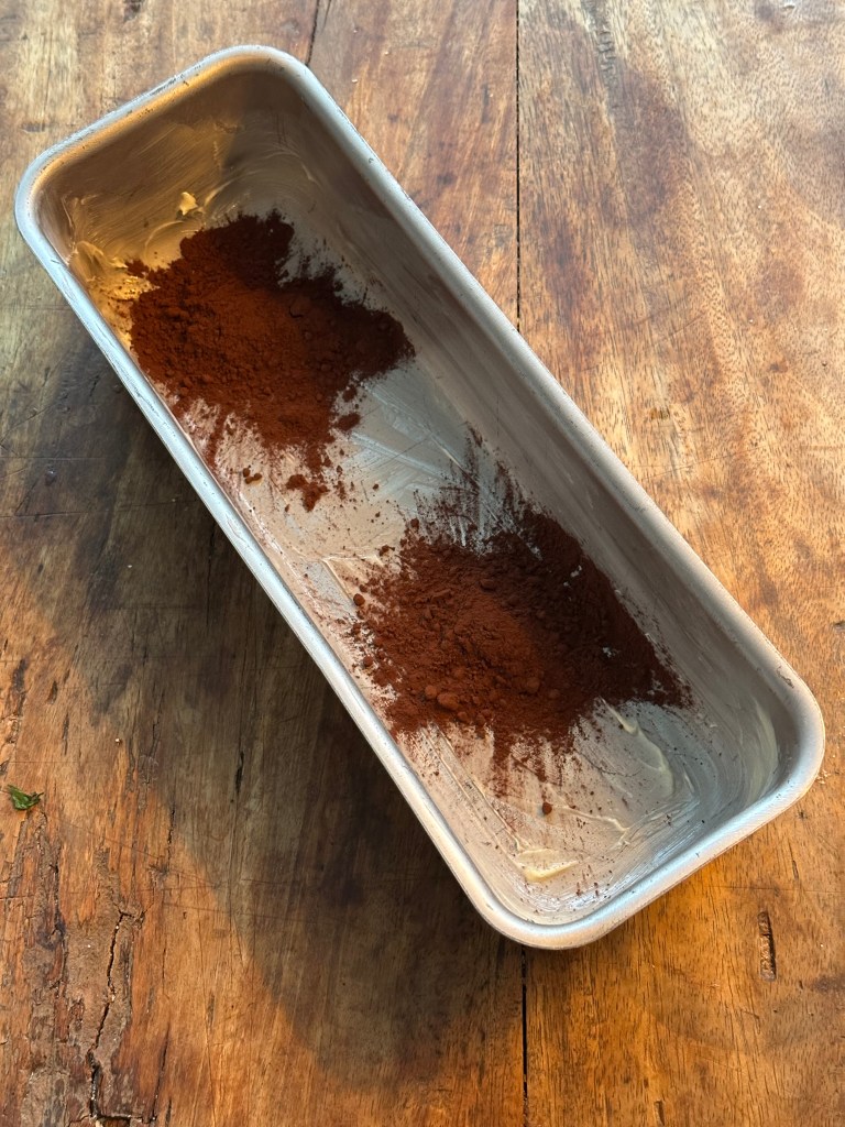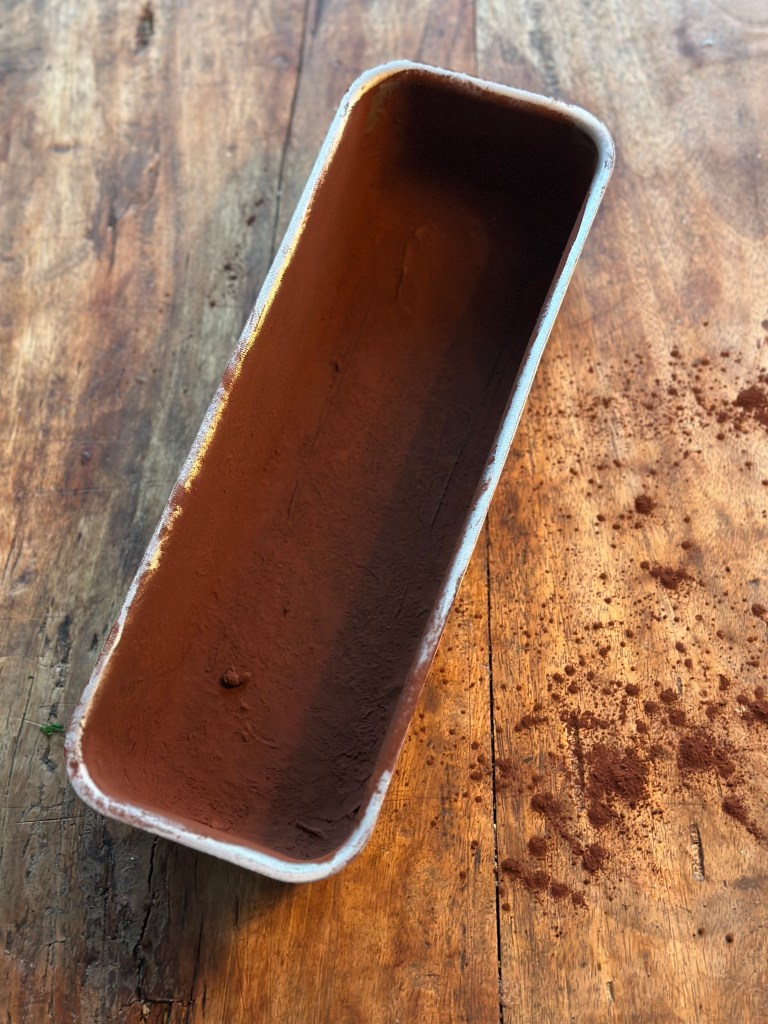 Smør formen hele vejen rundt. Brug gerne dine fingre. Kom herefter kakaopulveret ned, og fordel ved at ryste formen. Hæld det overskydende pulver fra. Stil formen til side.