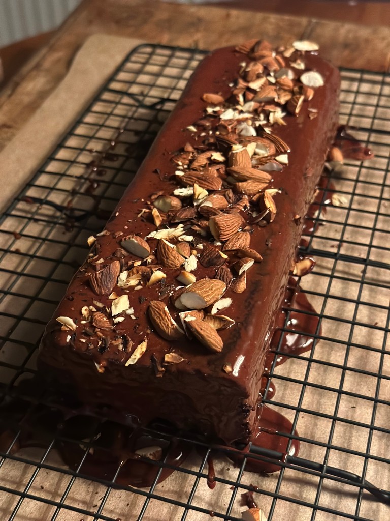 Placer den afkølede kage på en rist. Sæt risten på noget bagepapir, som er større end kagen. Chokolade toppingen skal straks efter at den er blendet, ellers kan den blive for tyk i konsistensen. Den kan dog varmes op igen. Fordel toppingen fra side til side over kagen. Sørg for at alle sider bliver dækket.