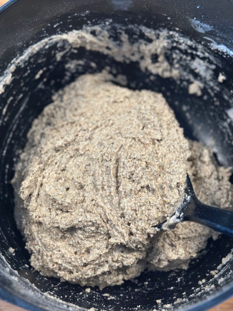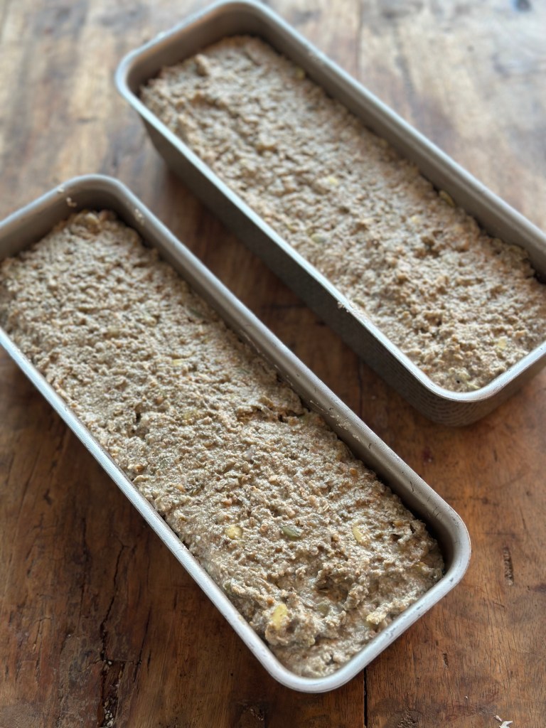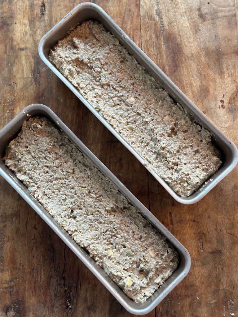 Smør en stor form – eller 2 mindre a med olivenolie. Dejen hæver en del, så nøjes med at fylde 2/3 op – så hellere i 2 forme end 1, hvis der ikke er plads.