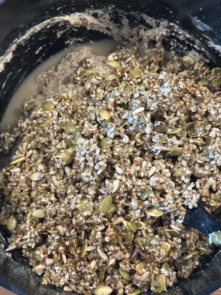 Sættes i blød i 500 gram vand i godt 6-8 timer, til vandet er suget op i kernerne, og der kun er lidt tilbage. Smag gerne på blandingen (som du rører rundt indimellem) – det skal være muligt at tykke alle kerner.