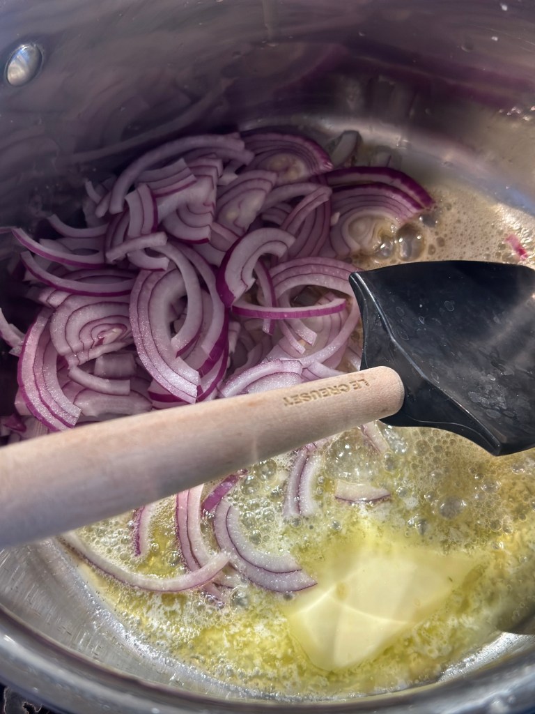 Saften kommer jeg i gryden sammen med fløde. Lad det simre lidt, og smag til med salt og peber.