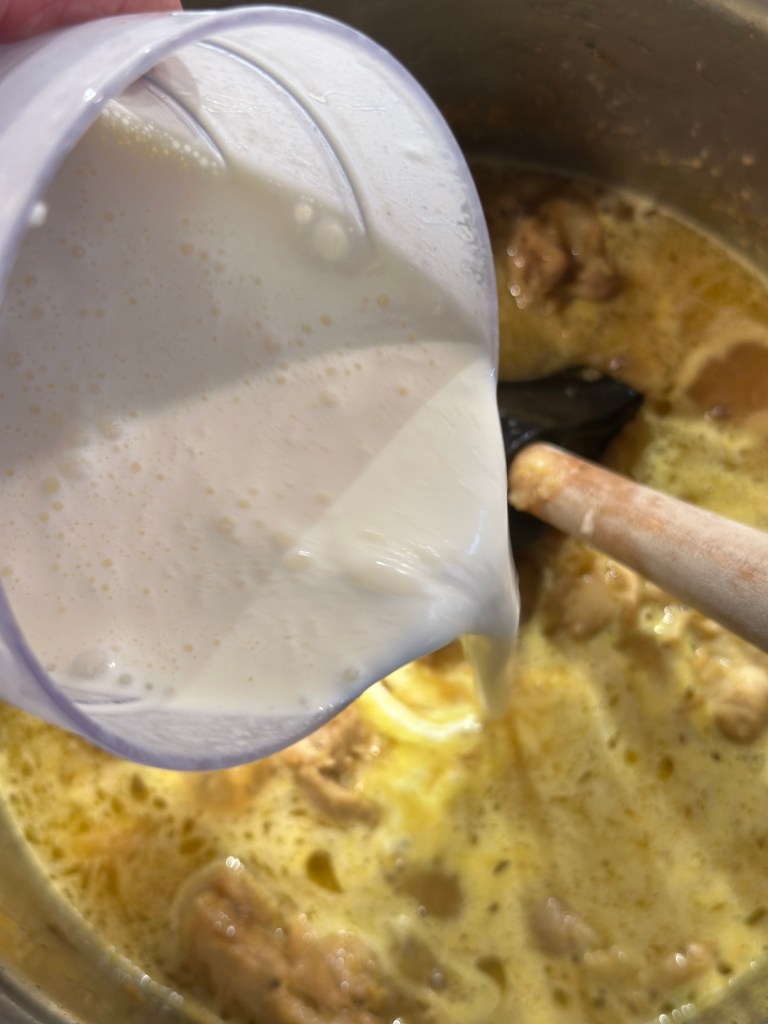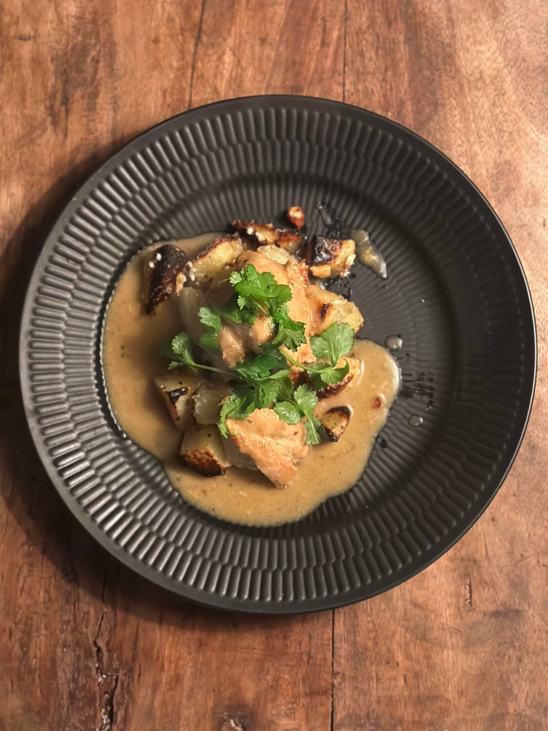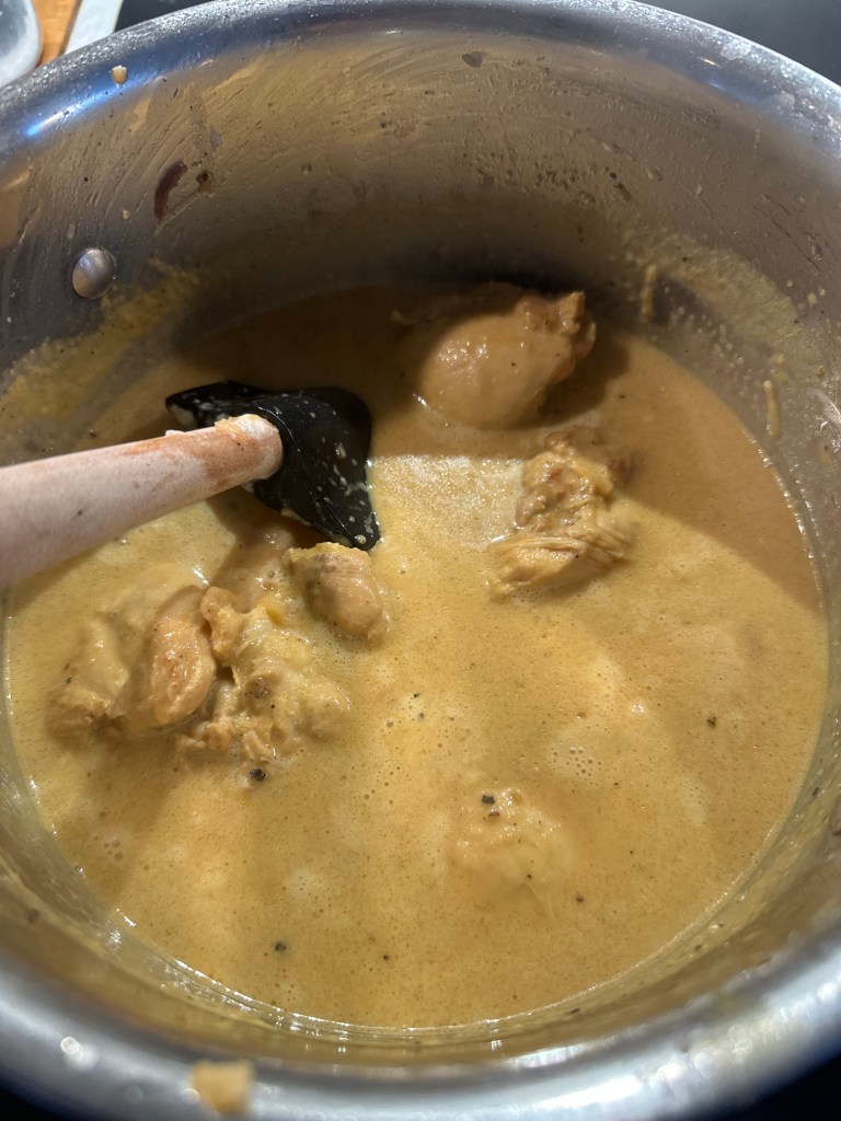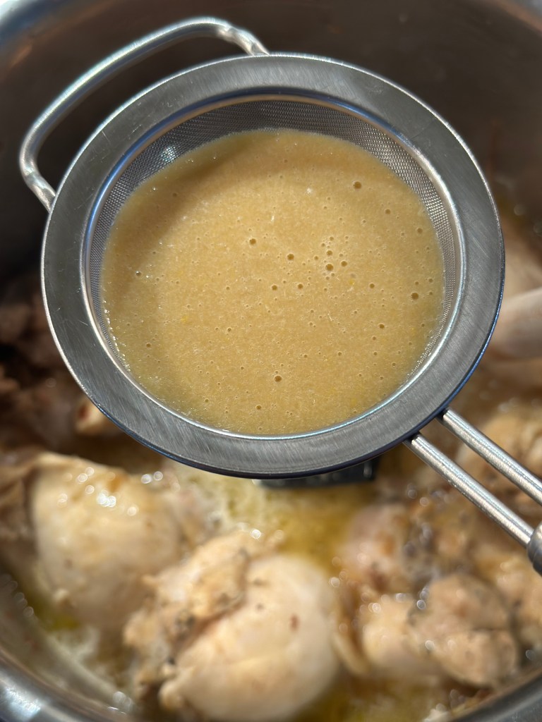 Den oprindelige ret kalder på en fond. Da jeg ikke vil bruge købefond, som er ultraforarbejdet, tilbereder jeg kyllingen i en gryde med danskvand, løg og hvidløg. Og da jeg bruger udbenet kylling lår, så kommer der masser af saft og kraft.