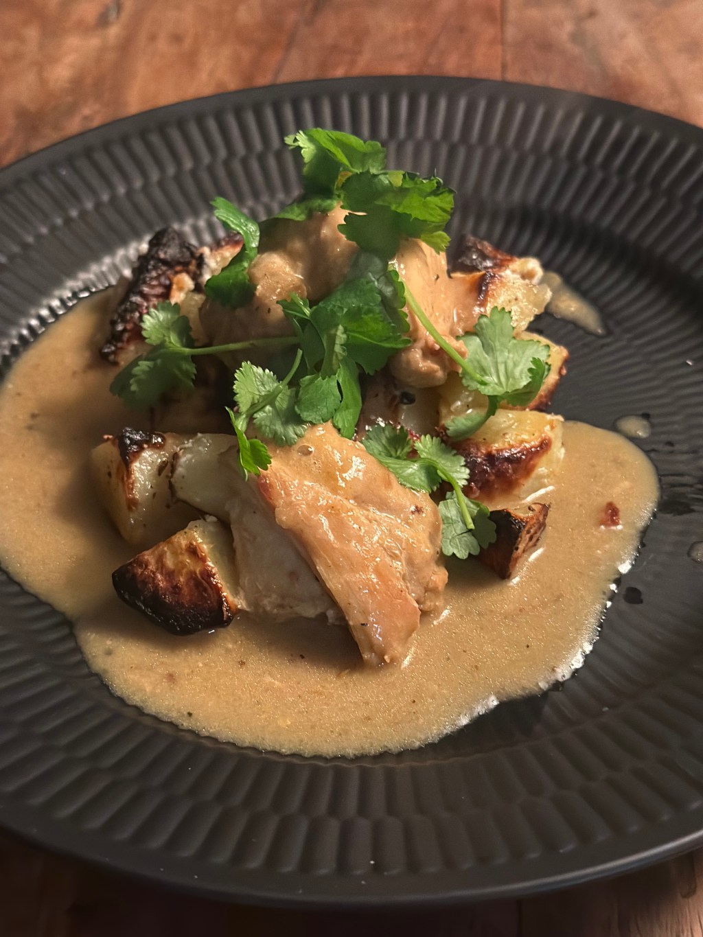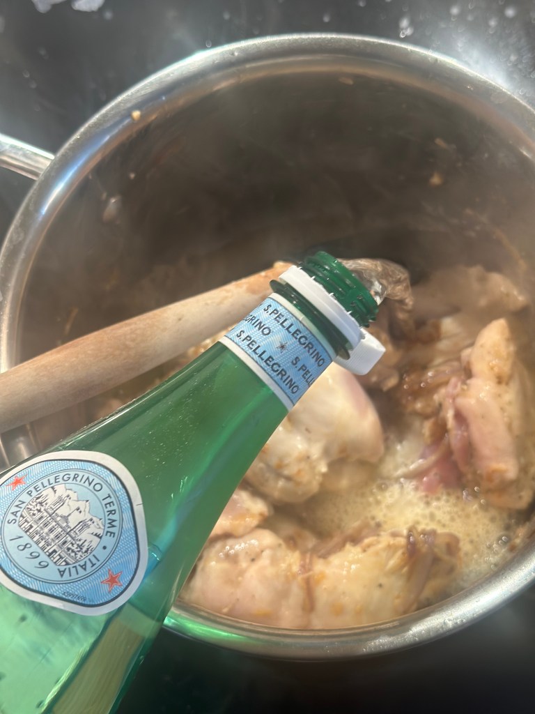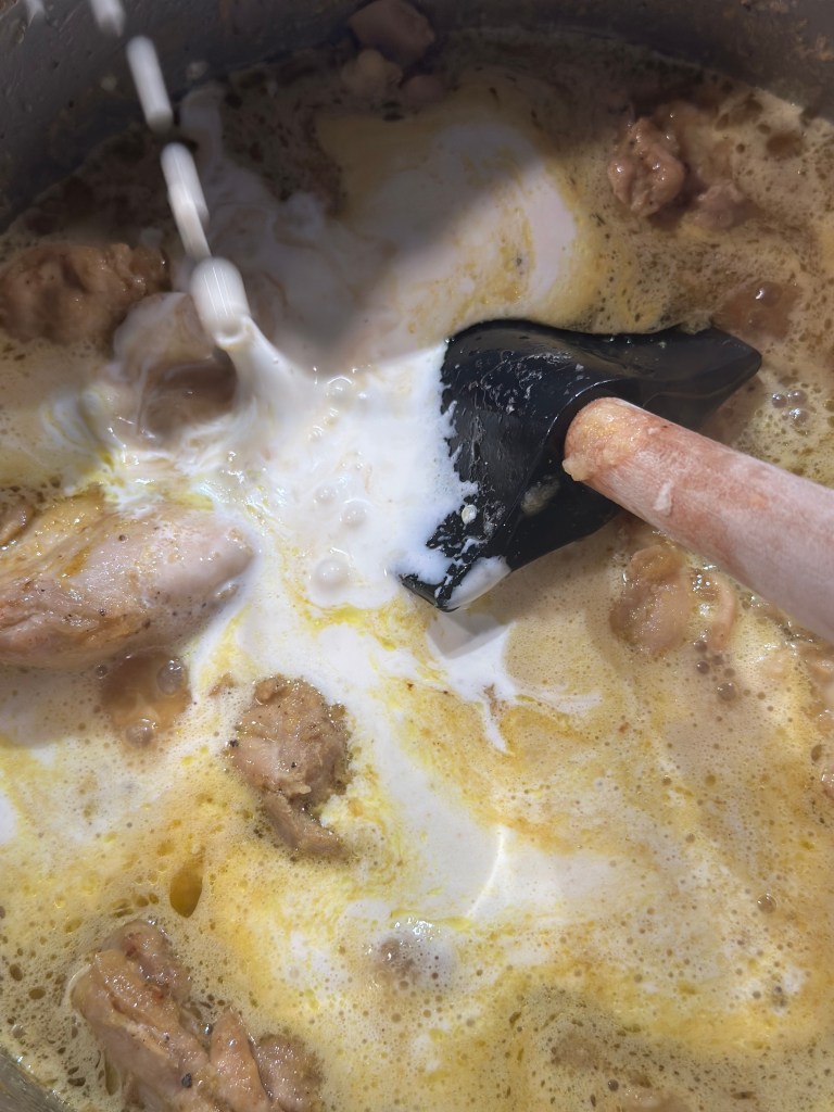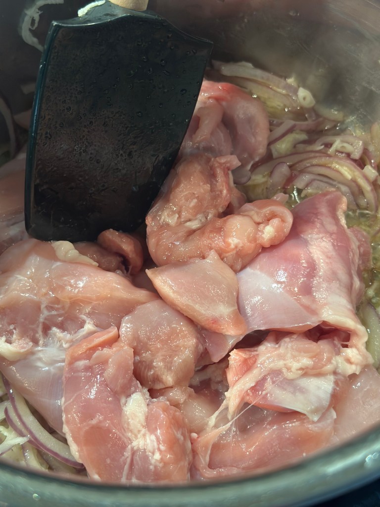 Den oprindelige ret kalder på en fond. Da jeg ikke vil bruge købefond, som er ultraforarbejdet, tilbereder jeg kyllingen i en gryde med danskvand, løg og hvidløg. Og da jeg bruger udbenet kylling lår, så kommer der masser af saft og kraft.