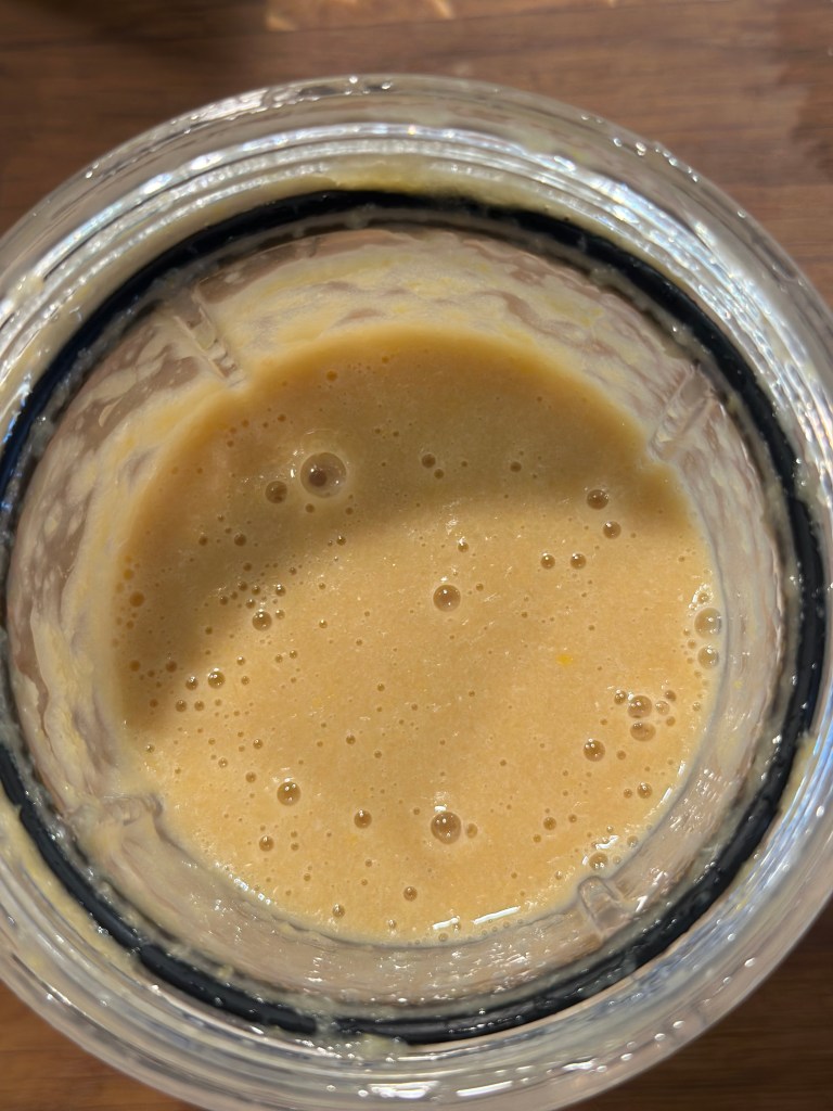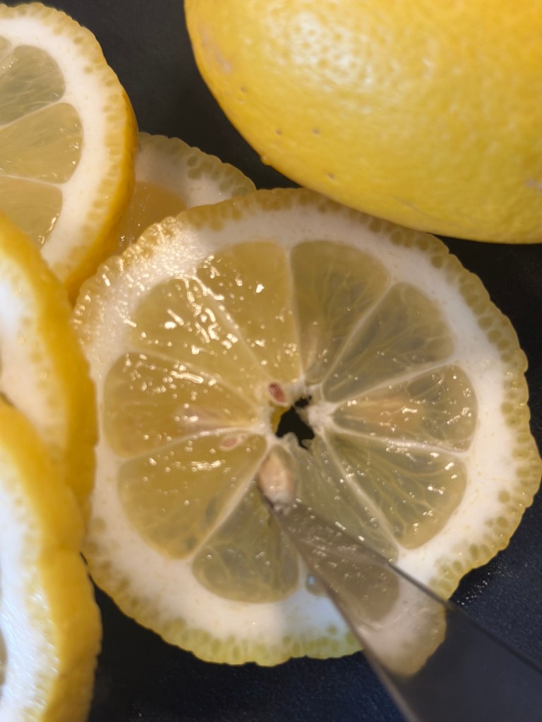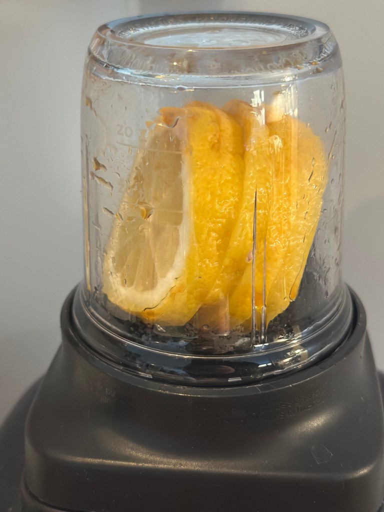 I mens laver du en citronpaste. Tag en hel sprøjtet citron og vask den. Skær den i skiver og kom den i en blender sammen med soyasaucen. Blend godt. Jeg vælger at si pasten til saft – men du kan jo bruge resten til at justere smagen med, så den bliver som du kan lide den.