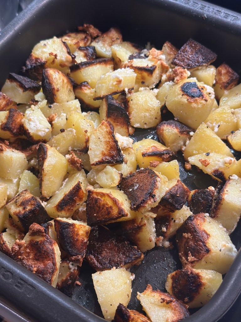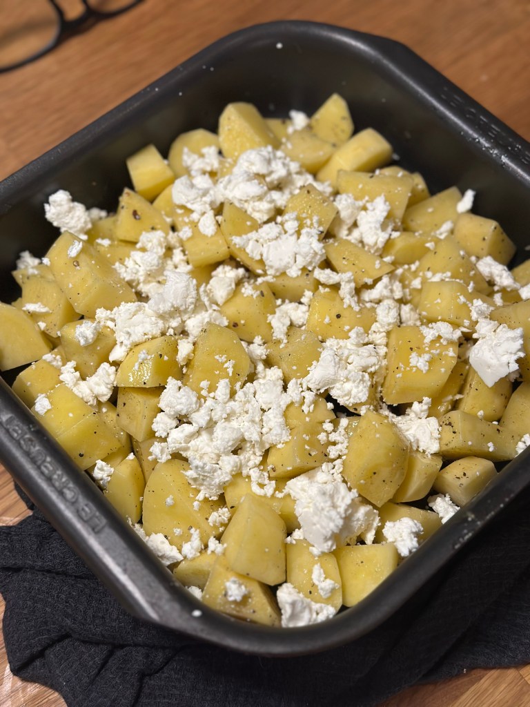 Jeg serverer med kartofler som blot er skåret i stykker og kommet i ovnen med et halt stykke feta ost.