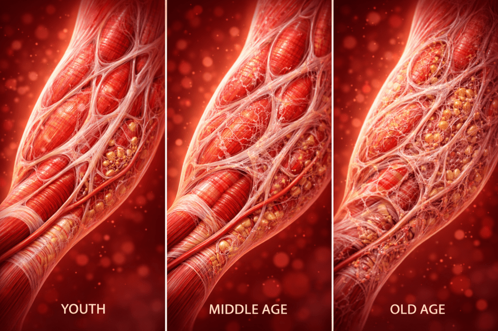 Fra omkring 25–30 års alderen begynder produktionen af kollagen gradvist at falde. Bindevævet bliver stivere, restitution tager længere tid, mindre elastin, og øget risiko for overbelastningsskader. Hvis man er meget stillesiddende, kan fascierne også blive mere “klæbrige” og mindre glidevenlige.