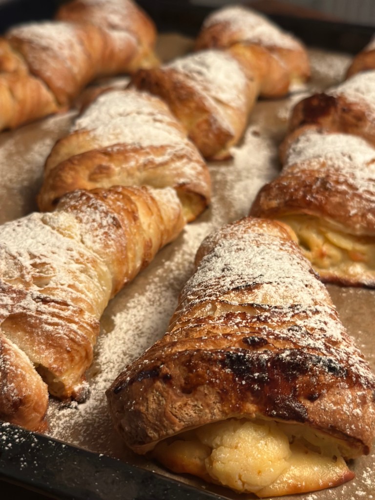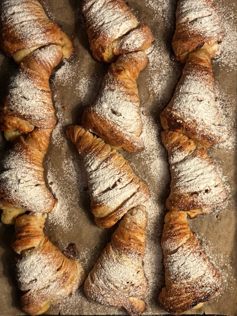 Sfogliatella er en klassisk italiensk kage (wienerbrød) fra Napoli, kendt for sine sprøde lag og cremet fyld. Den findes i to versioner – Sfogliatella riccia (“krøllet”) er den mest kendte version med mange tynde, sprøde lag, der ligner en muslingeskal. Sfogliatella frolla som er llavet med en mere mørdej-agtig dej – blødere og mindre sprød. Jeg laver her “riccia” udgaven.