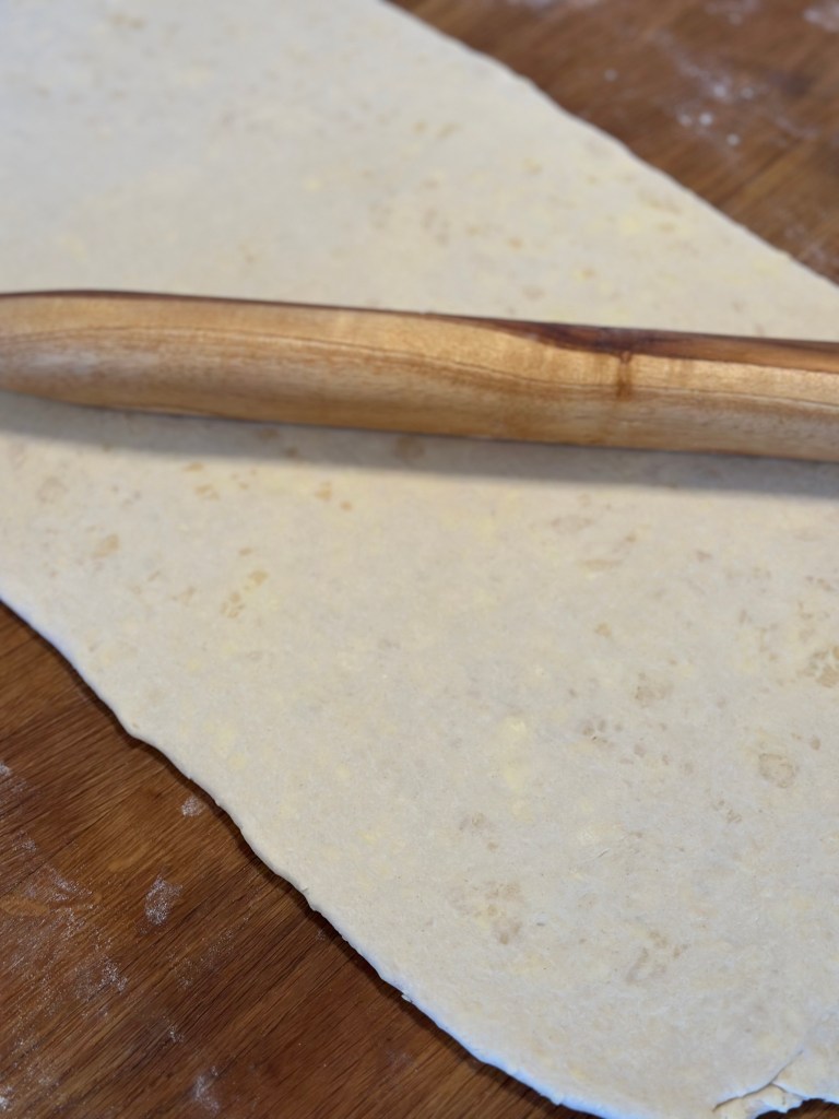 - Tag dejen ud af køleskabet og rul den meget tyndt ud. Det tager lidt tid, for dejen er kold. Men det er vigtigt den er helt tynd.