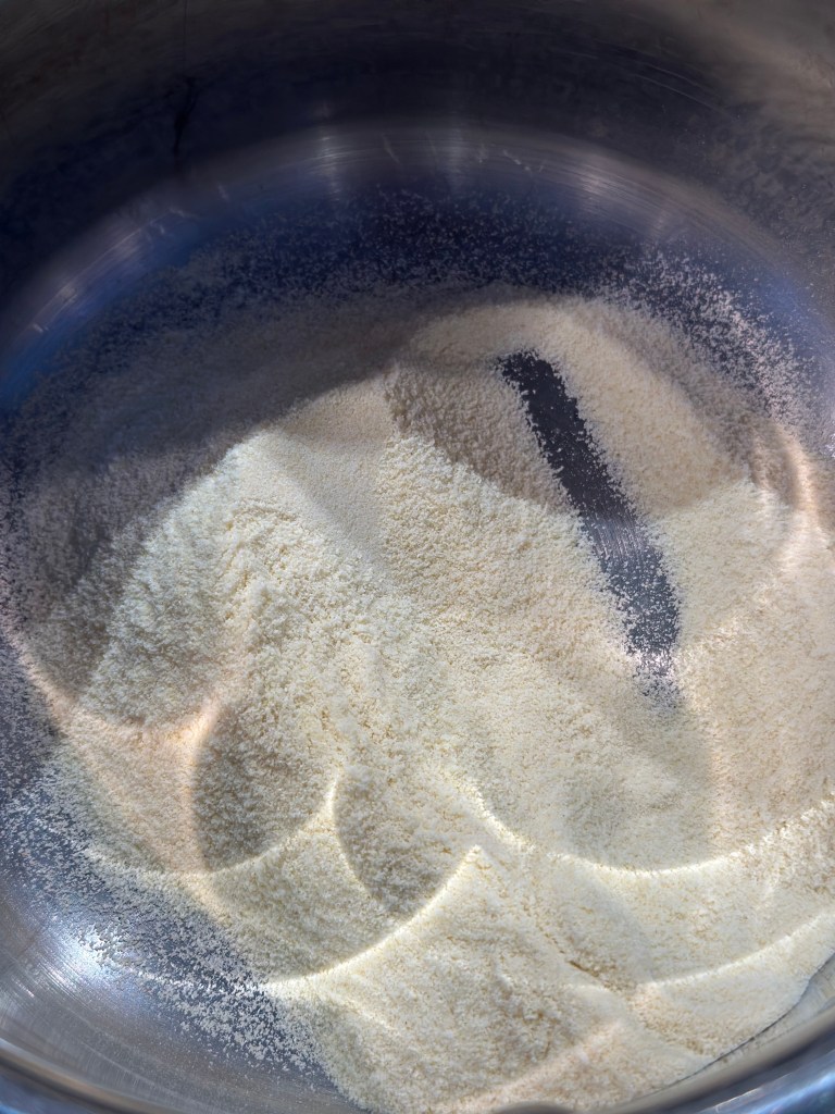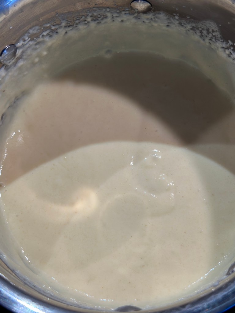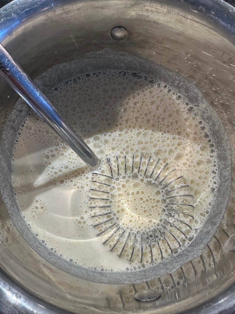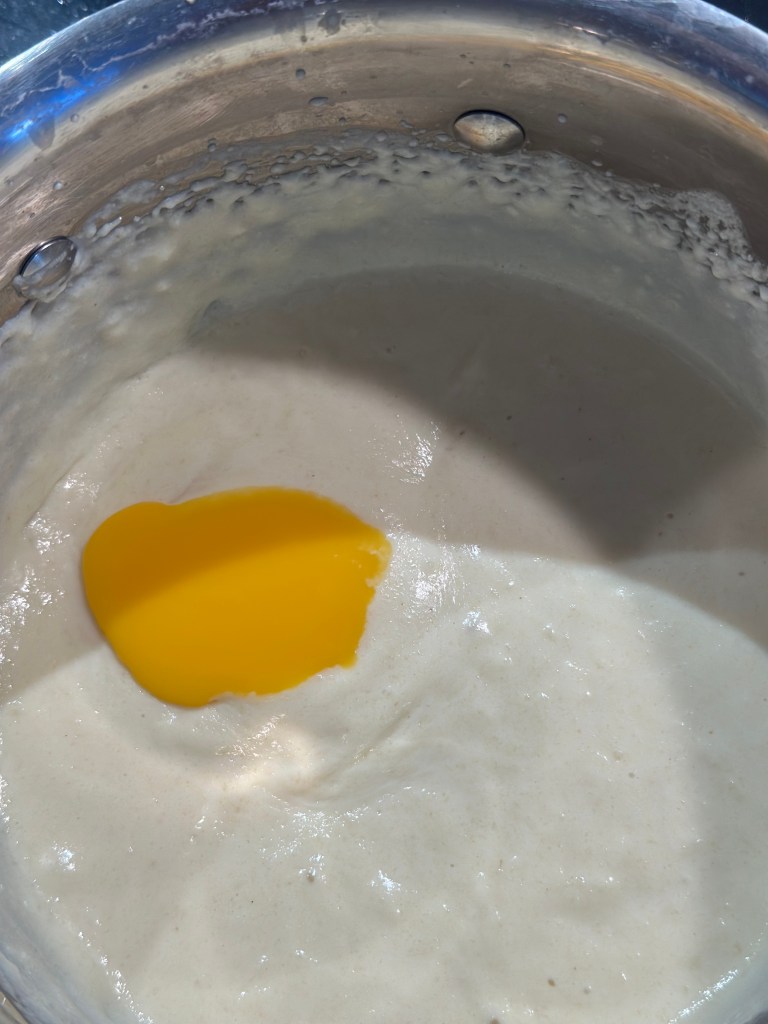 - Først kommer man semulje mel og mælk i en kasserolle. Varmer stille op indtil det stivner – rør i det hele tiden. Lad den køle. Kom herefter æggehviden i, og pisk den ind i massen.