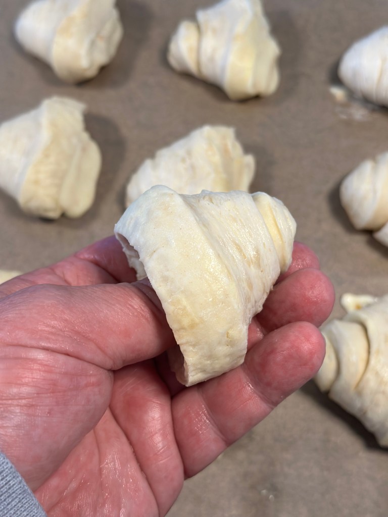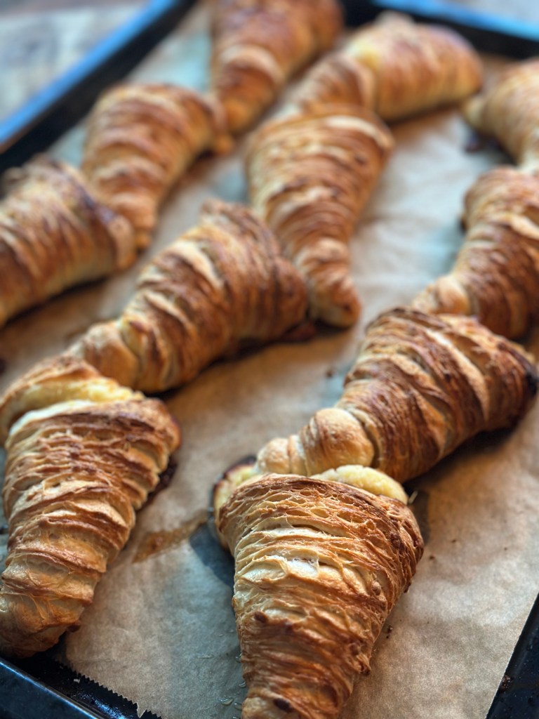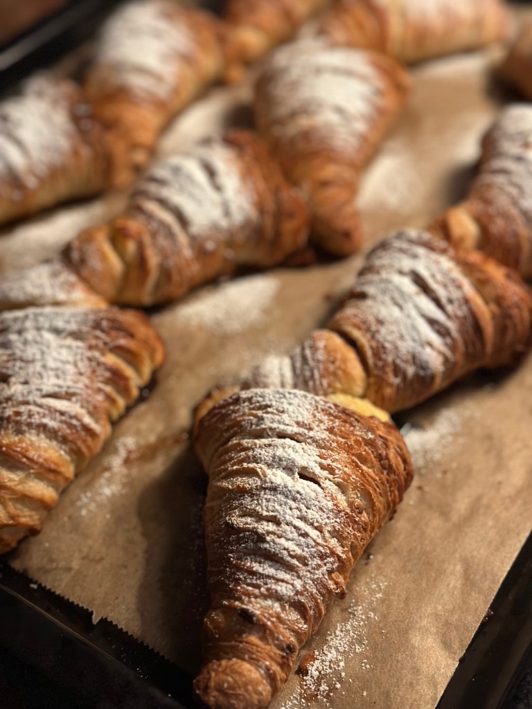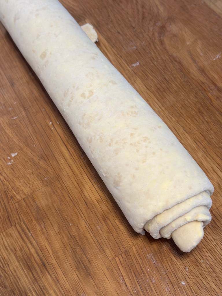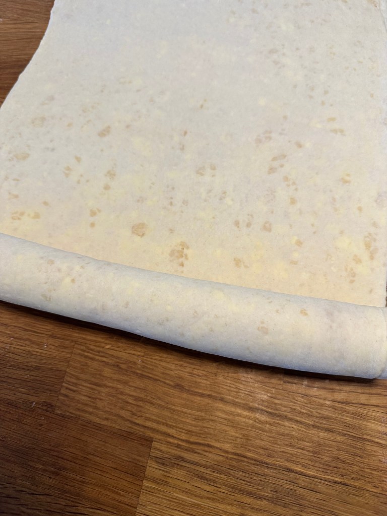 Så begynder processen med at skabe lag på lag. Man starter med at rulle dejen ud. Man monterer koldt smør på 2/3 af dejen og folder først den del uden smør mod midten og bagefter den sidste del over. Så ruller man den ud igen, og folder igen 3 gange. Det gentager man yderligere en gang. Herefter kommer man dejen på køl indtil man skal bruge den – og den kan sagtens være på køl et par dage.
