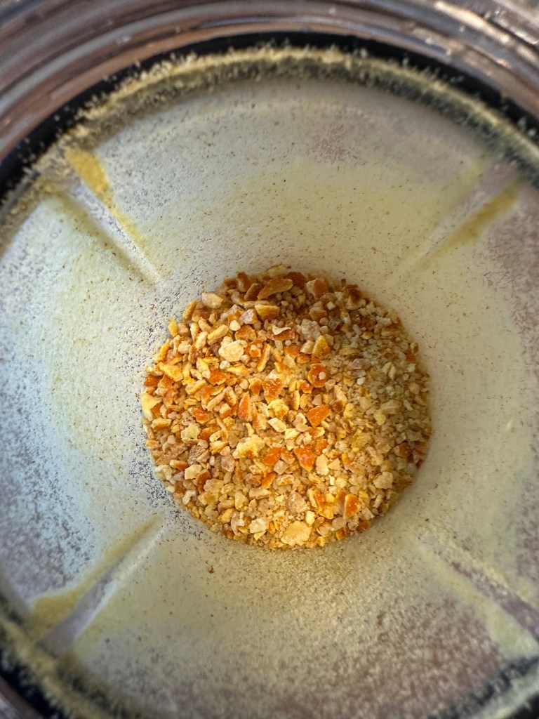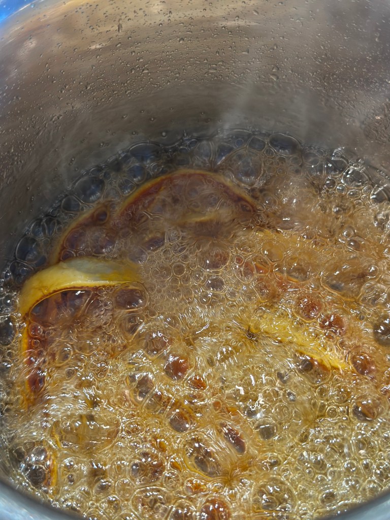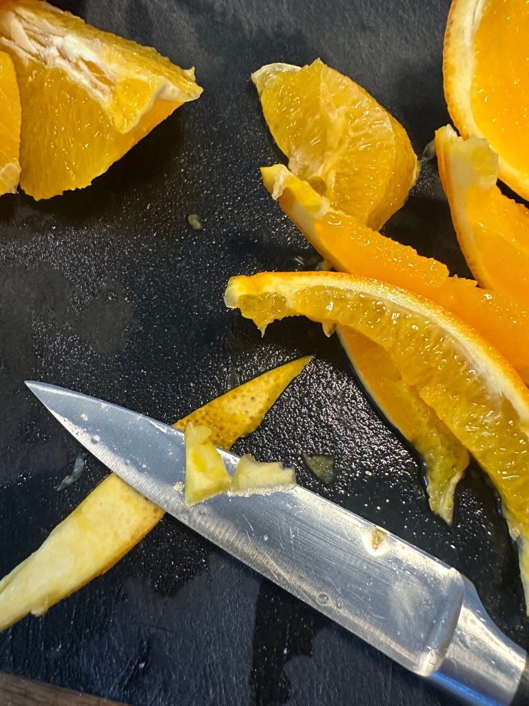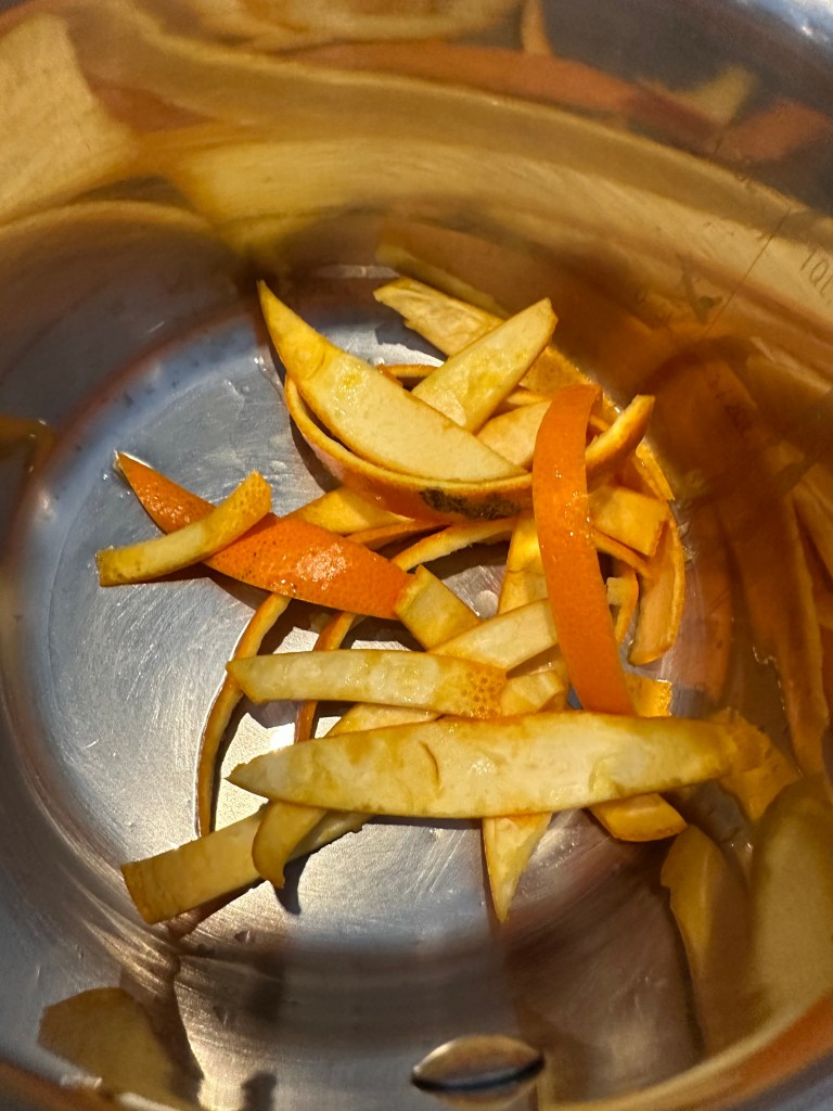 Start med at lave den kandiseret appelsinskaller. Fjern indmaden, skær skallen i strimler, og fjern det meste at det hvide. Kom vand, sukker og skaller i en kasserolle og kog ind til karamel. Lad massen køle – og forvent den bliver hård – det er i orden. Jeg kommer den kolde masse i en nøddekakker og laver det på den måde finthakket.