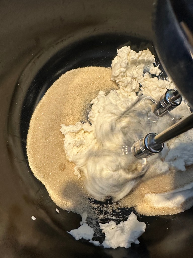 - I en anden skål pisker man ricotta osten med sukker og tilsætter vanilje. Tilfør den kandiseret appelsinskal. Pisk godt.