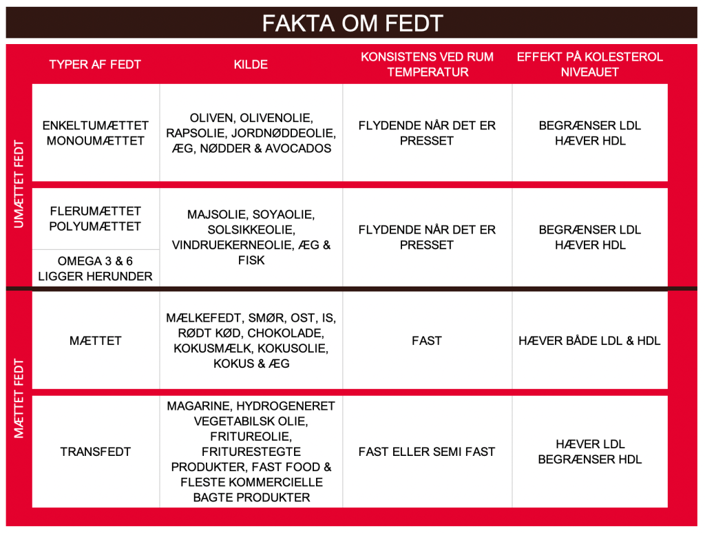 I mange år er man blevet belært om, at fedt ikke er godt for kroppen. Undersøgelser igennem de seneste år, giver dog et mere nuanceret billede af fedt og således kan man nu dele fedt op indenfor ”det gode” og ”det skadelige”. Minimum 20% af energien bør komme fra fedt og max 30%. Ved under 20% får man ikke dækket behovet for essentielle fedtsyrer, eller nok fedt til de fedtopløselige vitaminer – så det er vigtigt, at du får din fedt.