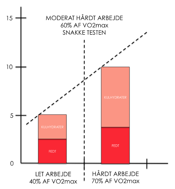Grafen viser forskellen på ved hvilke intensitetsniveauer, at forbrænder fedt kontra kulhydrater. Ved 40% af VO2max forbrænder man ca. lige meget fedt og kulhydrat, men man forbrænder ikke mange kalorier. Ved 70% af VO2max vender fordelen til kulhydraternes side og jo højere intensitet eskalerer denne udvikling samt forbrændingen af kalorier stiger hurtigere. Derfor vil det altid være mest hensigtsmæssigt af gå efter høj intensitets træning.