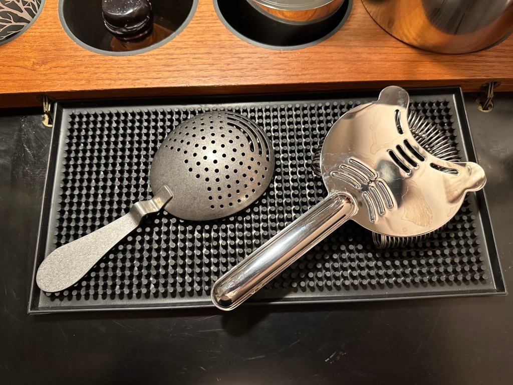 En strainer er en si som passer til din shaker. Har du en shaker med si, behøver du ikke en strainer. Den findes i 2 udgaver, den ene er en “julep” (til venstre) som er en stor ske med huller i – den ældste type. Den anden er en “hawthorne” som har en spiral rundt om, så den både passer bedre, men og kan si ud til kanten. Begges formål er, at sørge for der ikke kommer is med i glasset efter cocktailen er mixet.