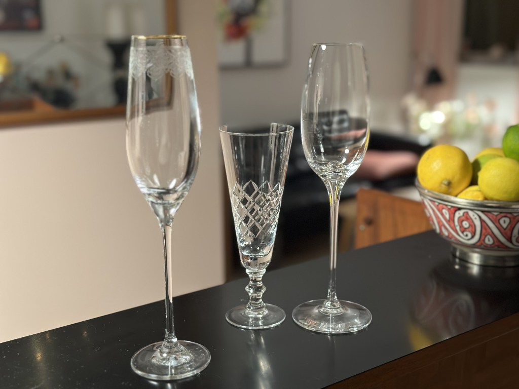 Dette glas holder absolut bedst på boblerne. og formen giver tillige en flot oplevelse. Der er ikke rigtig nogen præcise kilder til den oprindelse, Glasset i midten på billedet er en forlængelse af Jacobite glasset, som var meget brugt i 1700 tallets England – man mener dette glas var forløberen til Flute glasset, som fik sin udbredelse i 1950 og frem.