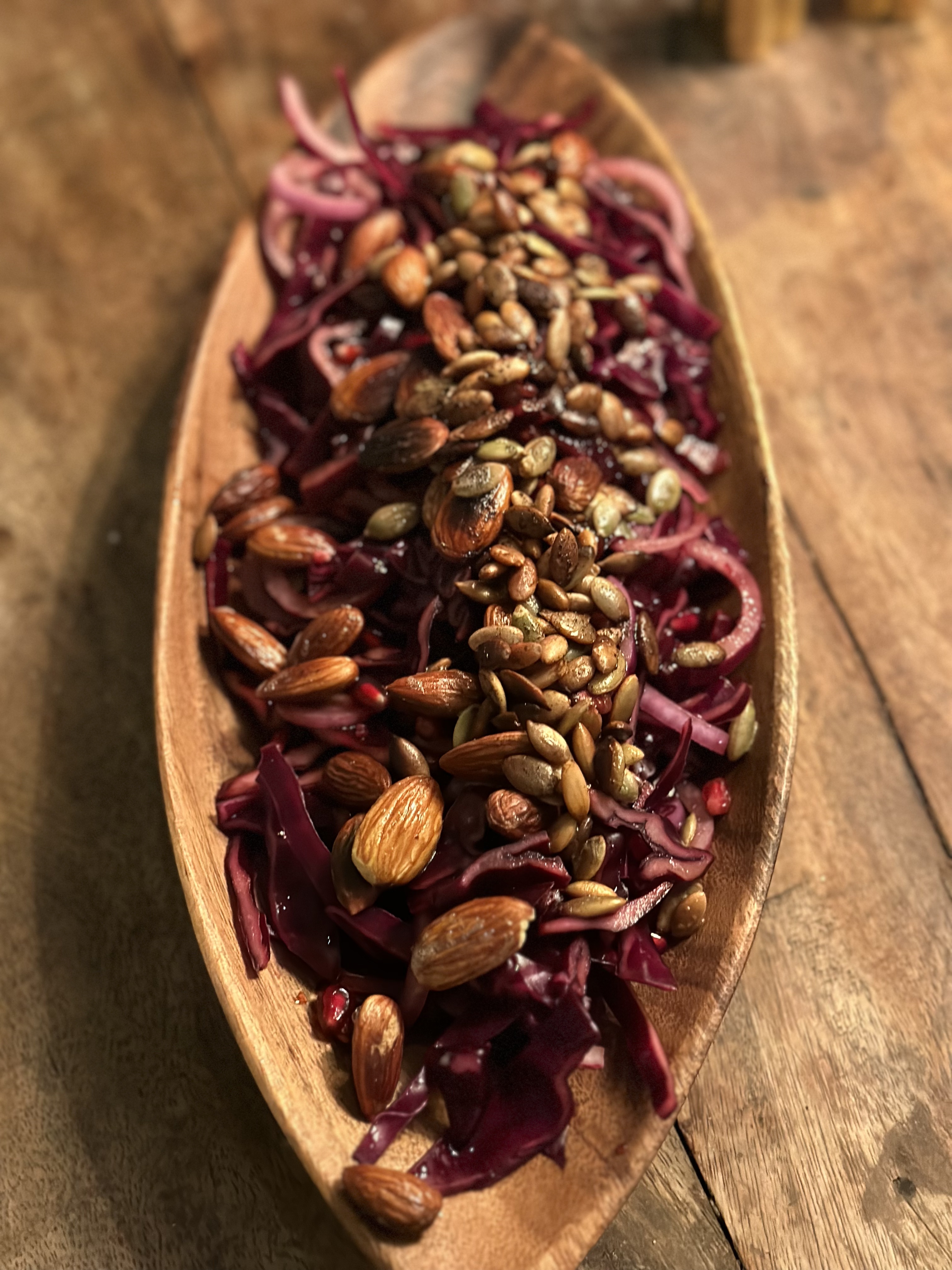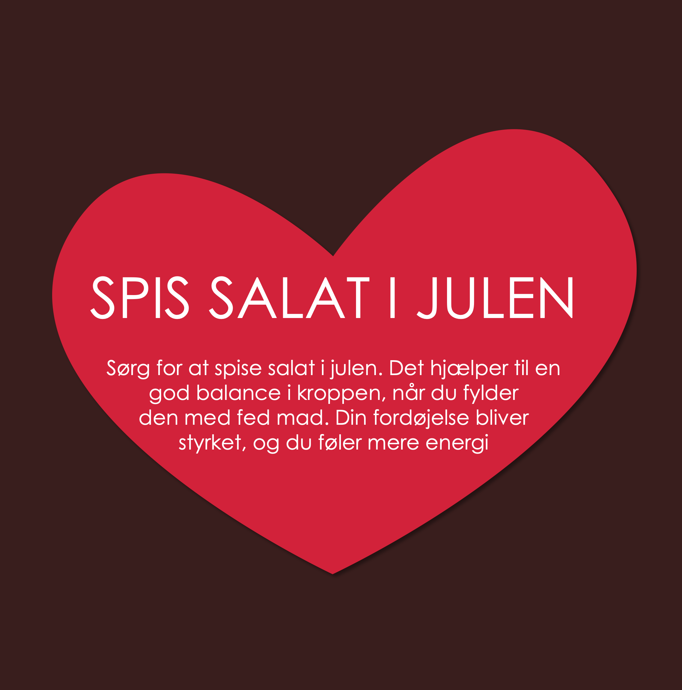 Spis salat hvor det er muligt. Du behøver ikke “den sunde ret” for i virkeligheden passer den ikke ind i hverken julefrokosten eller juleaften. Men tag de muligheder som der er, og gør dem mere fyldige. Det kan være rødkålssalaten, men det kan også være en rødbede salat til leverpostegen. Æbler i anden eller lav den marcipan selv.
