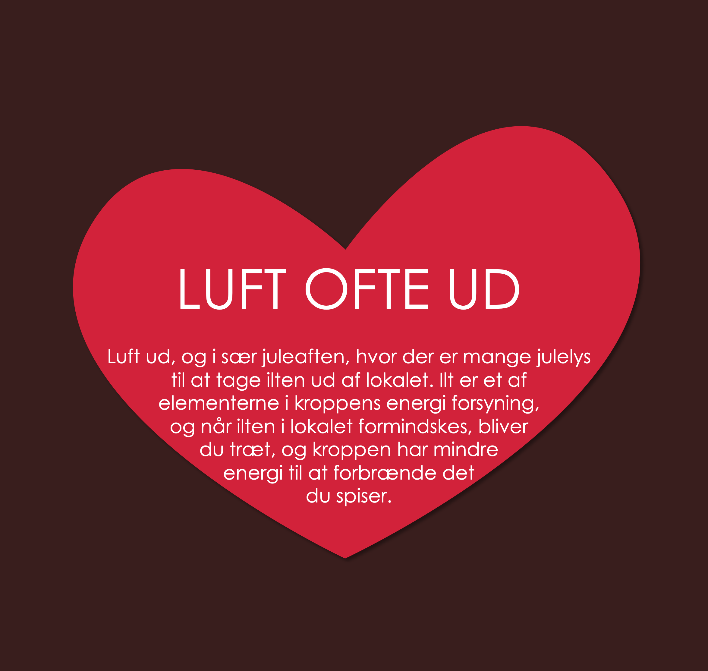 Frisk luft er også juleaften, hvor alle pludselig bliver trætte efter middagen. Det er ofte fordi kroppen kæmper med at fordøje den fede mad, men det er også fordi de mange stearinlys tager ilten fra rummet. Derfor er det en god ide, at lufte ud under julearrangementerne. Det giver også din krop mere energi til fx. fordøjelsen.
