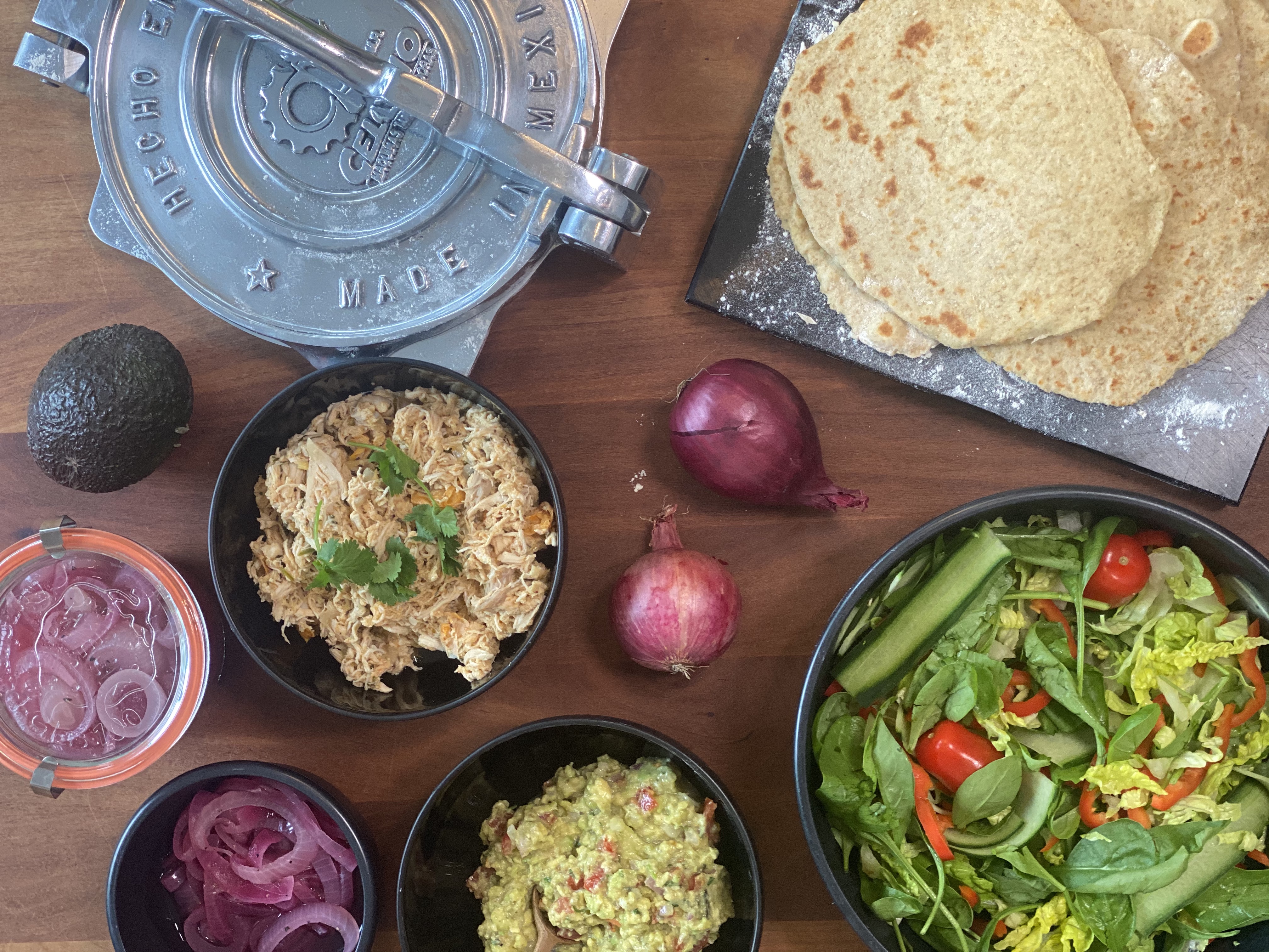 Jeg lavede Burito selv i min tacopresse, men valgte også at designe min dej selv: 1,5 dl vand Halv pakke gær 5 gram salt 1 spsk olivenolie 1 spsk skyr 150 gram Canadisk hvedemel 100 gram grahamsmel 100 gram kikærtemel Hæver en time, presses og bages på en pande i olivenolie.