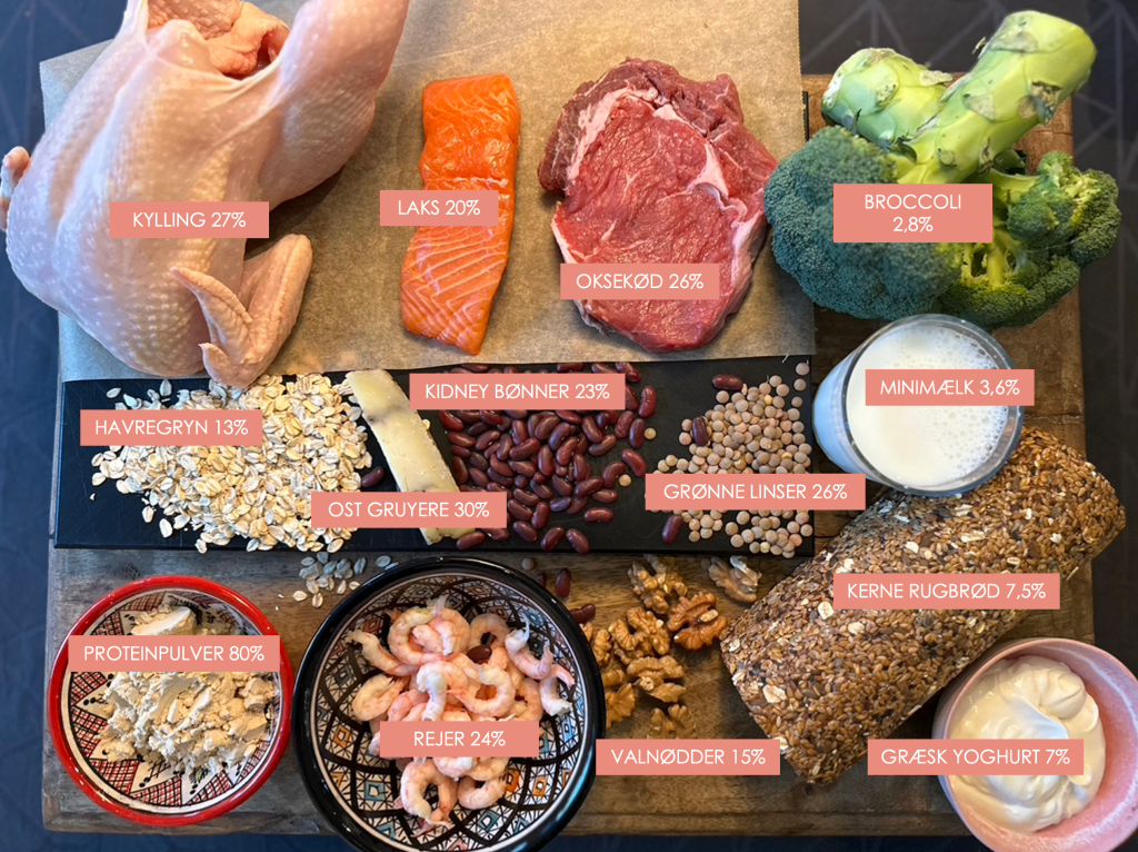 Andre gode kilder kan være havregryn, som har hele 13% og flere grødtyper. Alle nødder er også gode kilder – 13-22%, men vær opmærksom på et fedt niveau på op til 50%. Ost og mejeri generelt – igen vær opmærksom på fedt niveauet. Og endelig er der også et mindre siau i alle typer kål, herunder broccoli.
