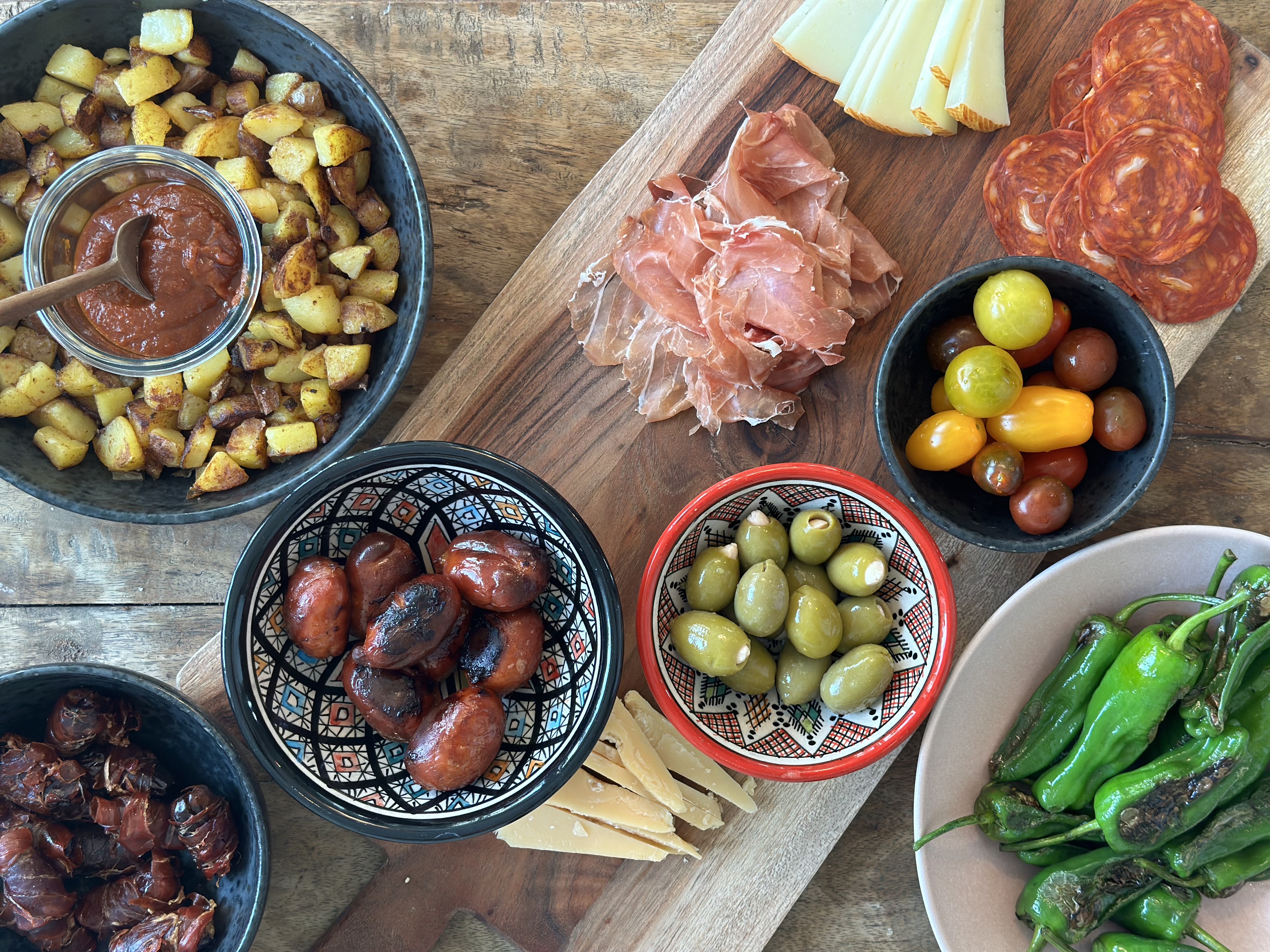 Jamón Iberico, Jamón Serrano, Chorizo, Manchego (fåreost), fisk, skaldyr, masser af frugt og grønt – men især tomater, appelsiner, peberfrugter og kartofler.