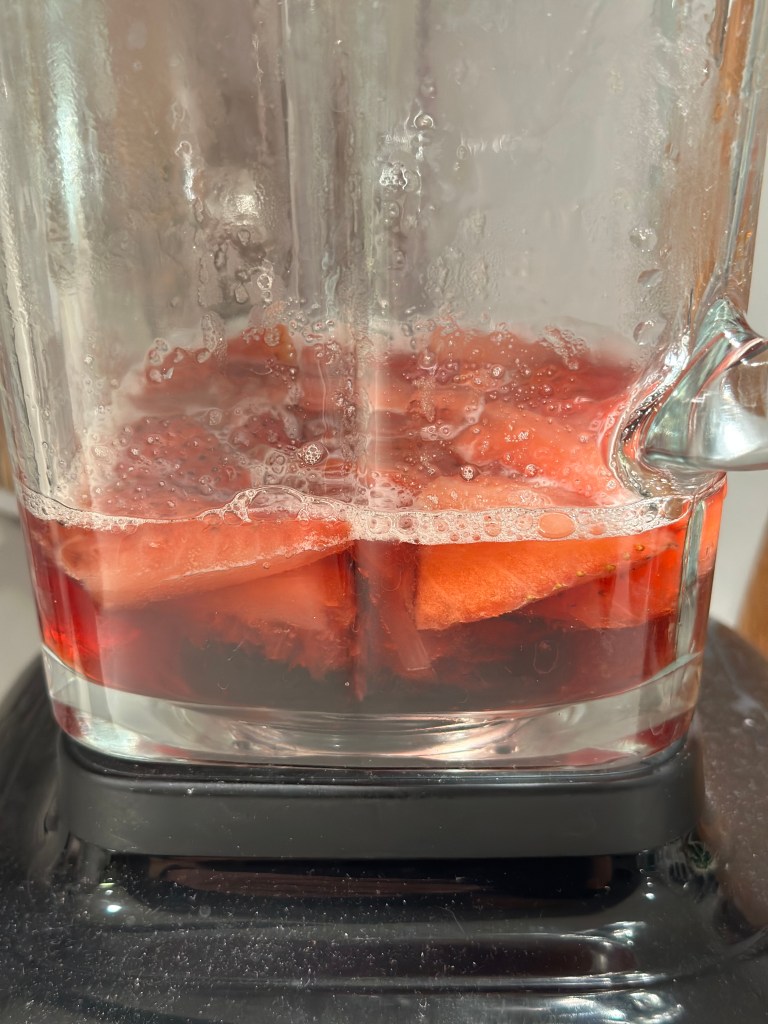 I sær om sommeren, er der mange drinks med Jordbær – og Hindbær. Både Jordbær og Hindbær har megen saft i sig, så jeg plejer at sige lidt mindre vand.