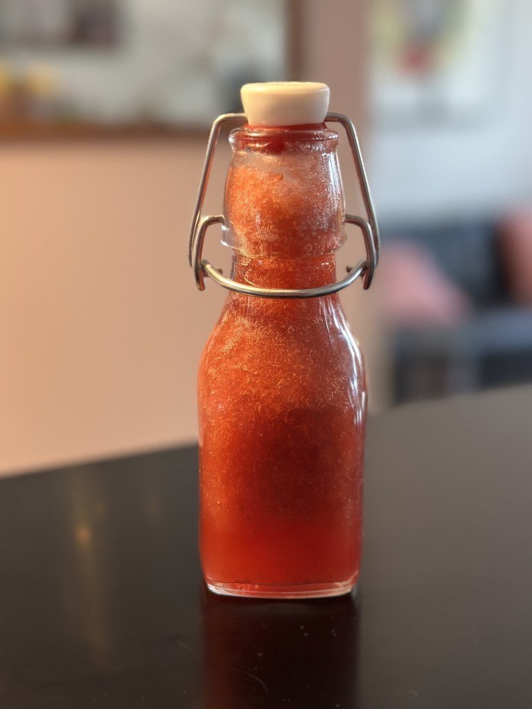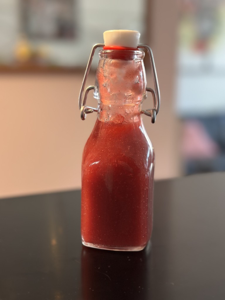 Sæt det hele i kog til du får en opløst masse – herunder sukkeret. Put det hele i en blender og hæld på flaske. Kan holde sig i lang tid på køl.