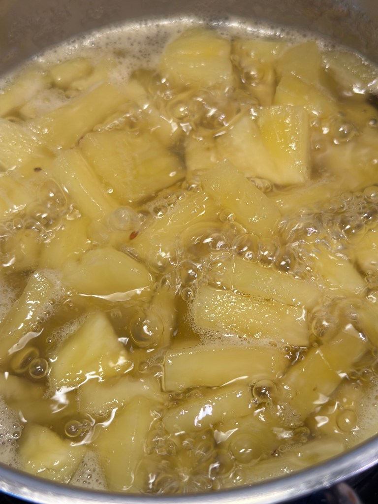 Mange opskrifter har ananas juice med, og da jeg bedst kan lide den højeste kvalitet uden tilsætningsstoffer, har jeg lavet denne ananas sirup som kan sættes i stede for ananas juicen. Og det smager så meget bedre.